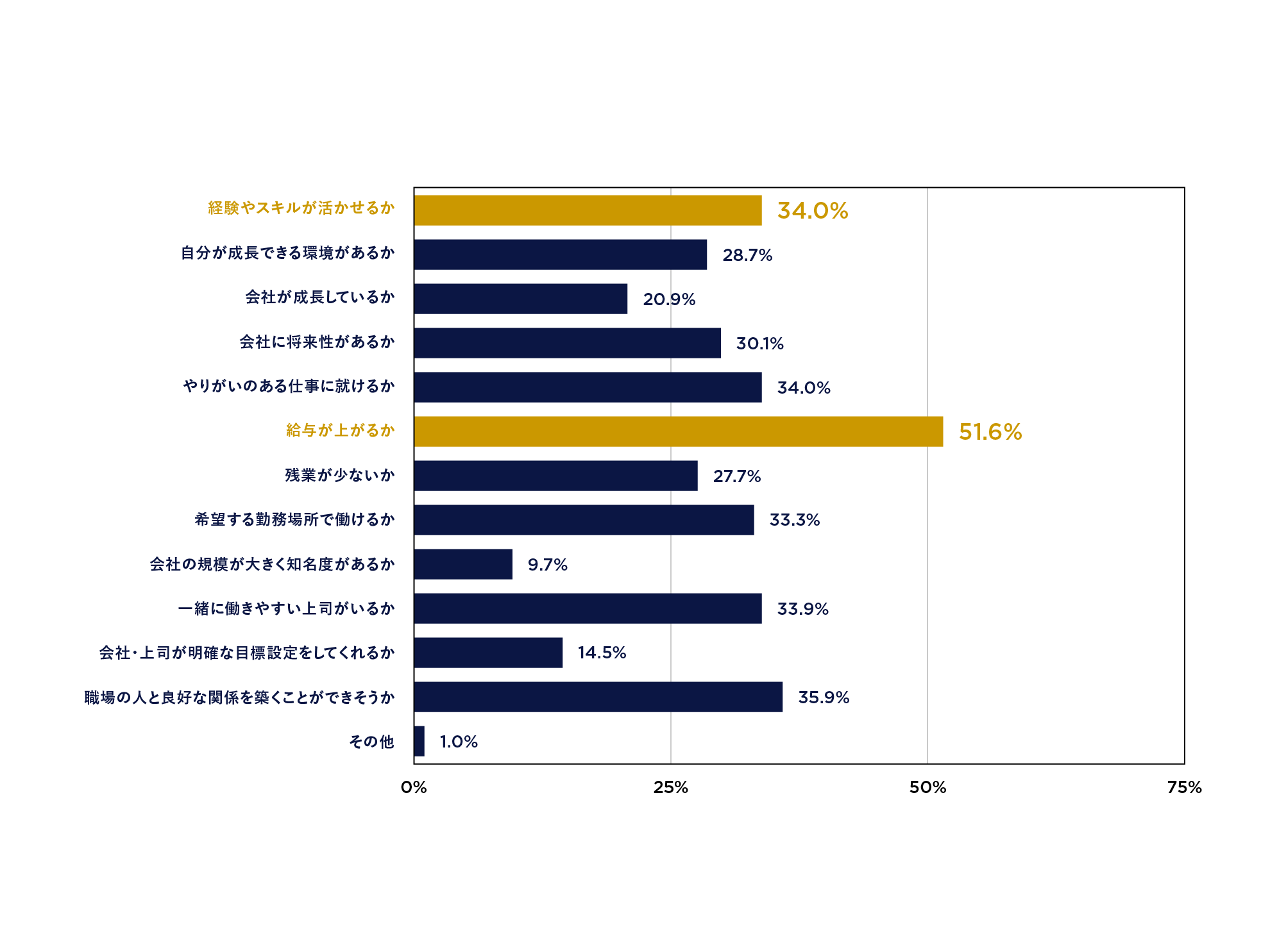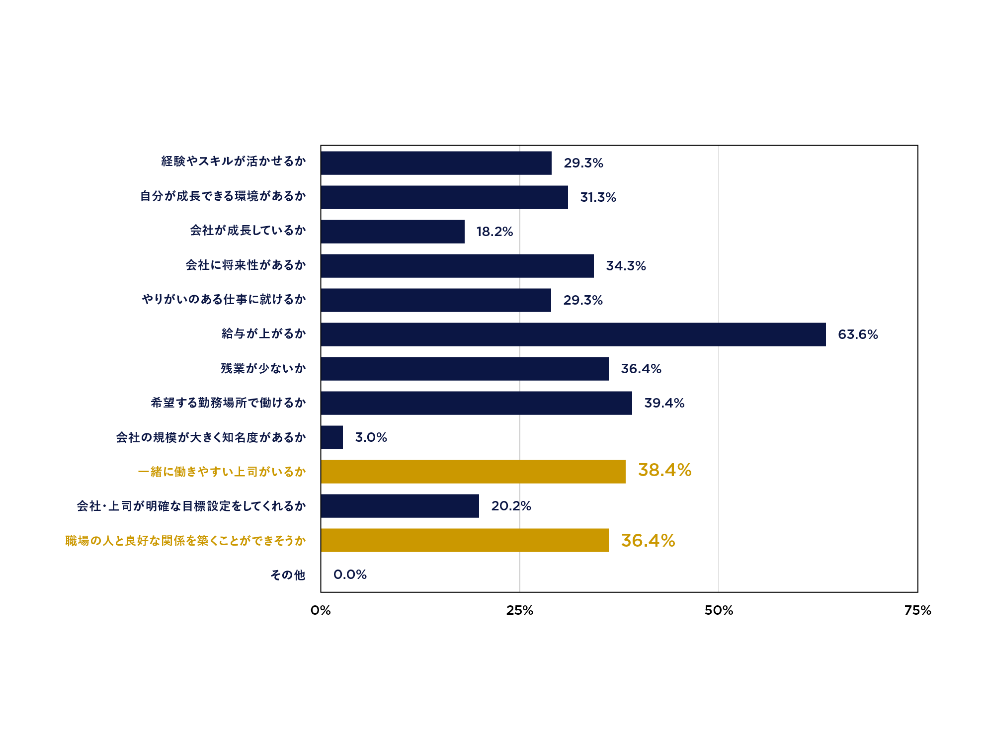 - 次の転職先選びで重視することは「給与」と「経験やスキルが活かせるか」のほかに、「働きやすい上司」と「職場内での良好な関係」も重視される