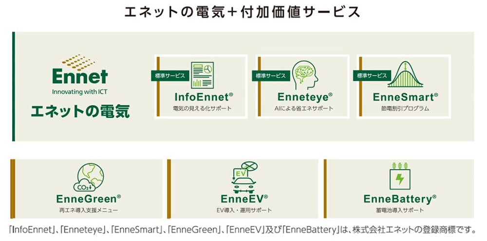 電気使用状況の見える化サービスInfoEnnetをはじめ、お客さまの省エネの取り組みをAIでシンプル・効率的にサポートするEnneteye (2019年度省エネ大賞経済産業大臣賞、2020年度IT賞IT奨励賞を受賞)及び節電要請に応じて節電いただくと電気料金を割引するデマンドレスポンスサービスEnneSmartを標準サービスとして提供しています。