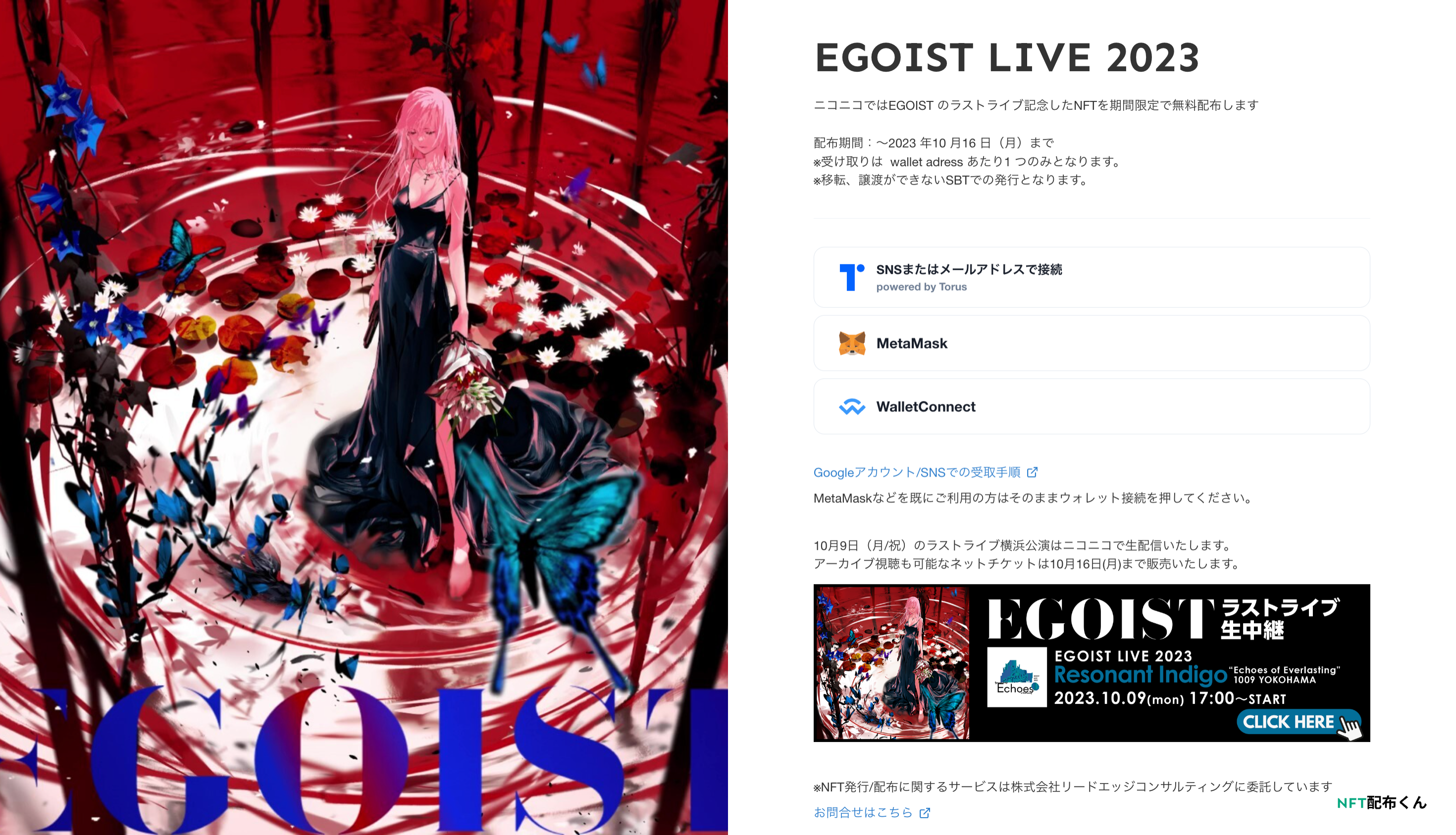 EGOISTのラストライブ記念したNFTを2023年10月5日(木)から10月16日(月)までの期間限定で無料配布します。EGOISTのNFTが発行されるのは今回が初となり、配布するNFTはEGOISTのキービジュアルを元にした動画になっています。ラストライブに参加した証、思い出として誰でも無料で受け取ることができます。