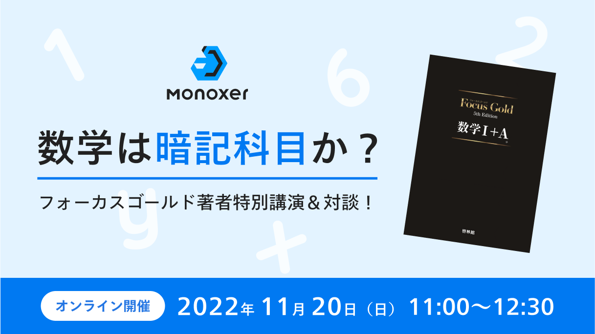 Focus GoldシリーズのMonoxer上での提供開始を記念して、11月20日(日)11時より『フォーカスゴールド著者特別講演&対談!数学は暗記科目か?』をテーマとしたWEBセミナーを開催します。