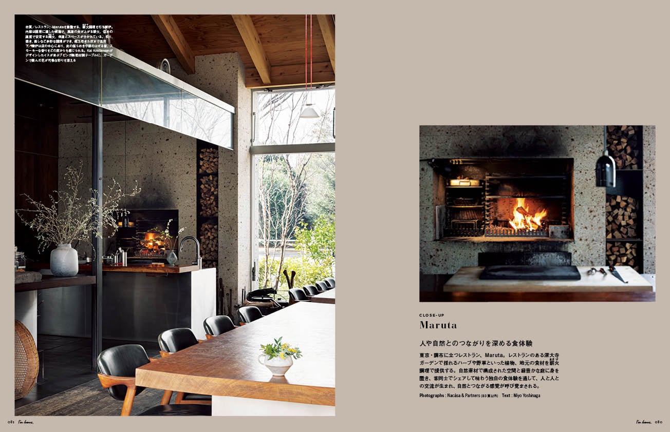 東京・調布に立つレストラン、Maruta。レストランのある深大寺ガーデンで採れるハーブや野草といった植物、地元の食材を薪火調理で提供。自然素材で構成された空間と緑豊かな庭に身を置き、客同士でシェアして味わう独自の食体験を通して、人と人との交流が生まれ、自然とつながる感覚が呼び覚まされます。
