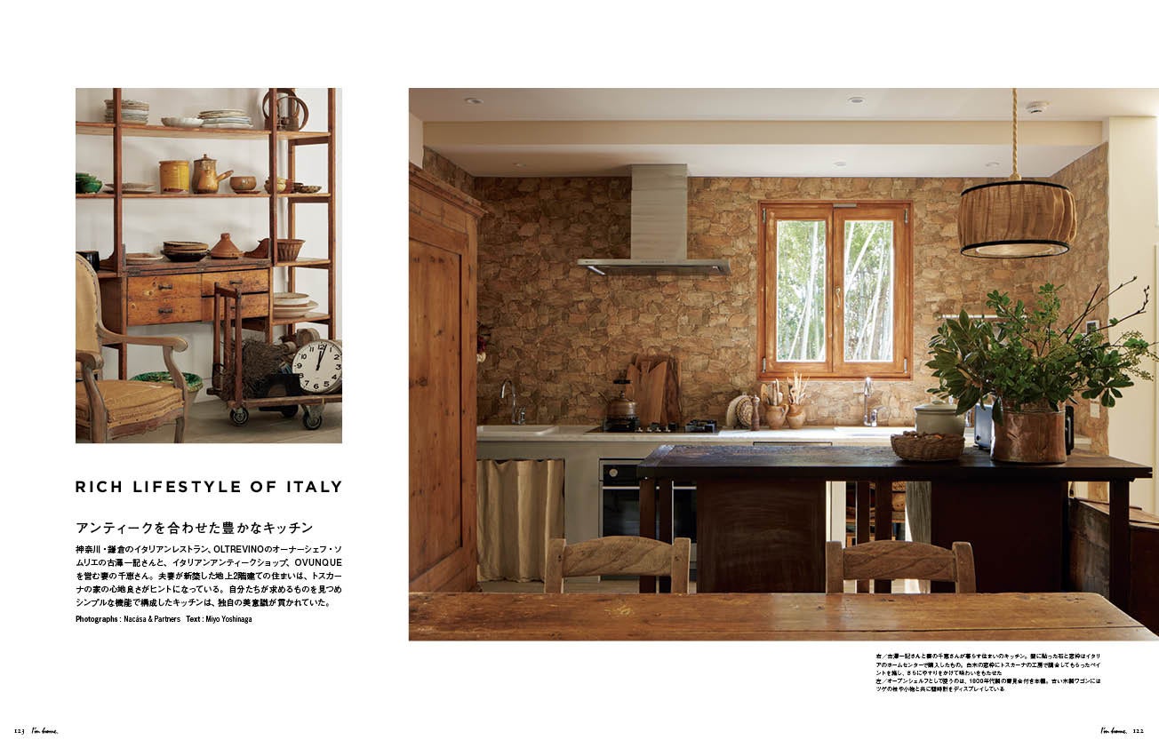 神奈川・鎌倉のイタリアンレストラン、OLTREVINOのオーナーシェフ・ソムリエの古澤一記さんと、イタリアンアンティークショップ、OVUNQUEを営む妻の千恵さん。夫妻が新築した地上2階建ての住まいは、トスカーナの家の心地良さがヒントになっています。自分たちが求めるものを見つめシンプルな機能で構成したキッチンは、独自の美意識が貫かれていました。
