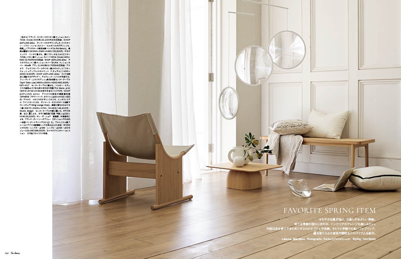 さわやかな風が抜け、日差しがまぶしい季節。新たな季節の訪れに合わせ、インテリアのアレンジも楽しみたいもの。光を受けてきらめくガラスのオブジェや花器、さらりと手触りの良いファブリック、籐を取り入れた家具や照明などのアイテムが登場します。