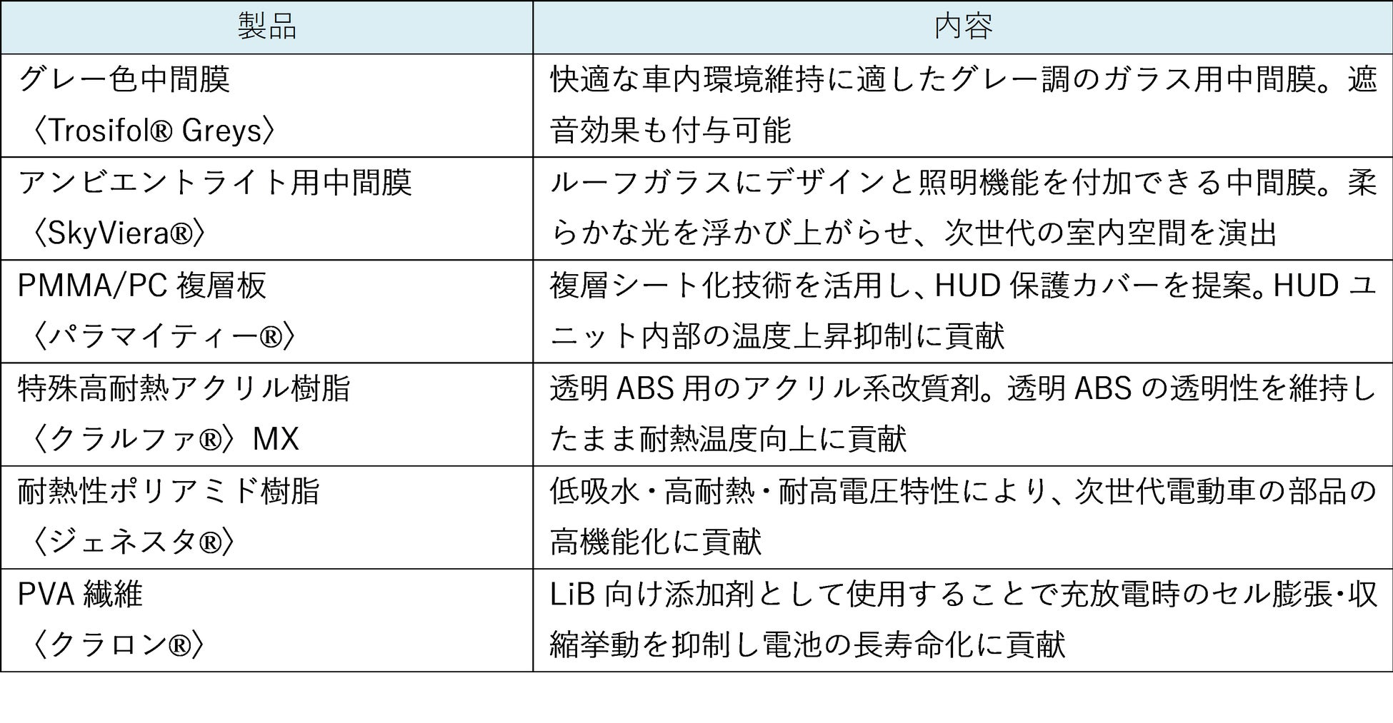 クラレグループの幅広い高機能素材を「脱炭素」「先端技術」の2つのテーマで紹介します。また、特別展示では、EV の高度化に好適なバッテリー周辺素材や脱炭素に貢献する軽量素材を用いたソリューションを提案します。加えて、ブース中央に、2種類の中間膜〈Trosifol® Greys〉と〈SkyViera®〉を用いた自動車用ガラスルーフのモックアップを展示します。