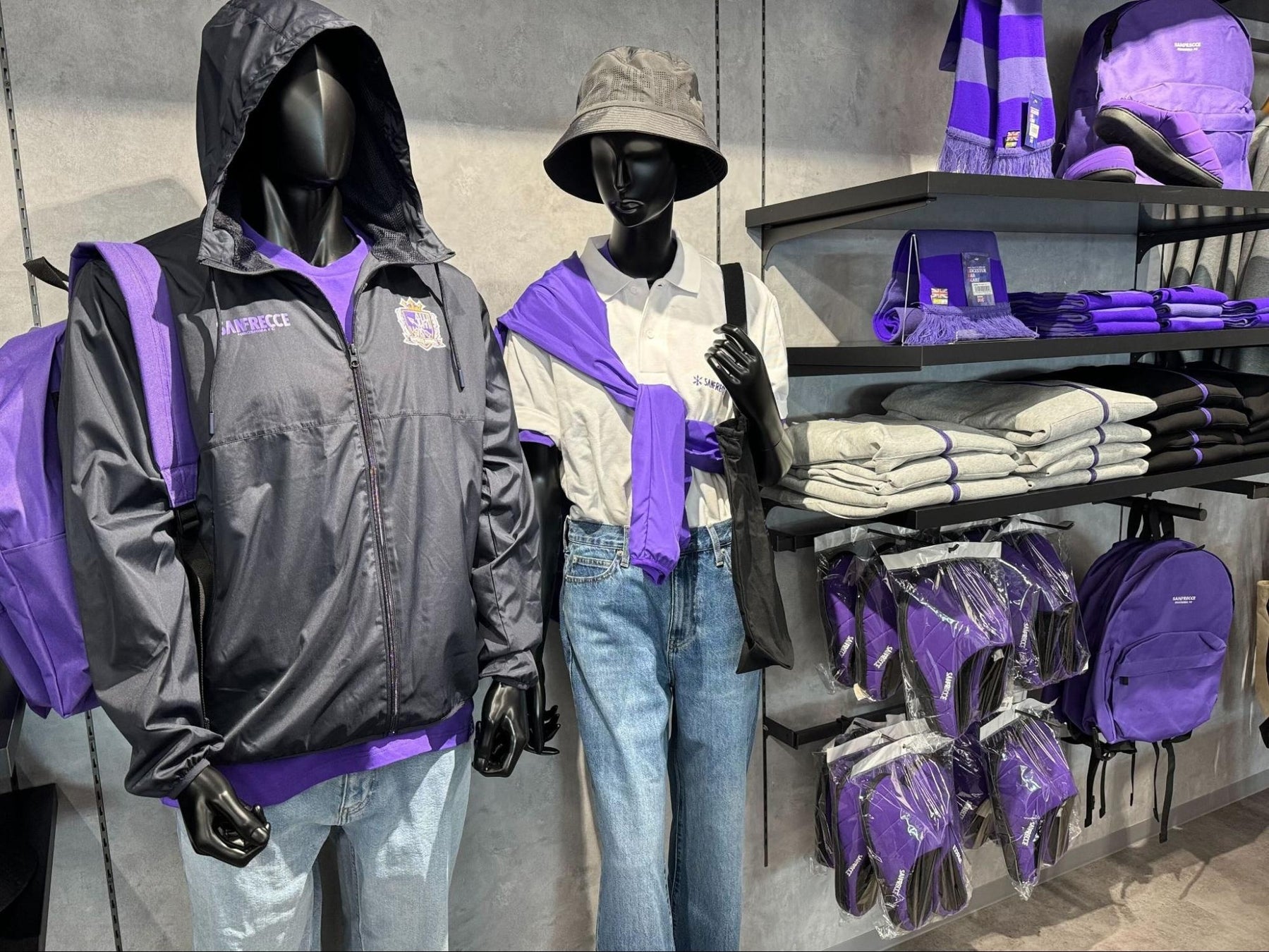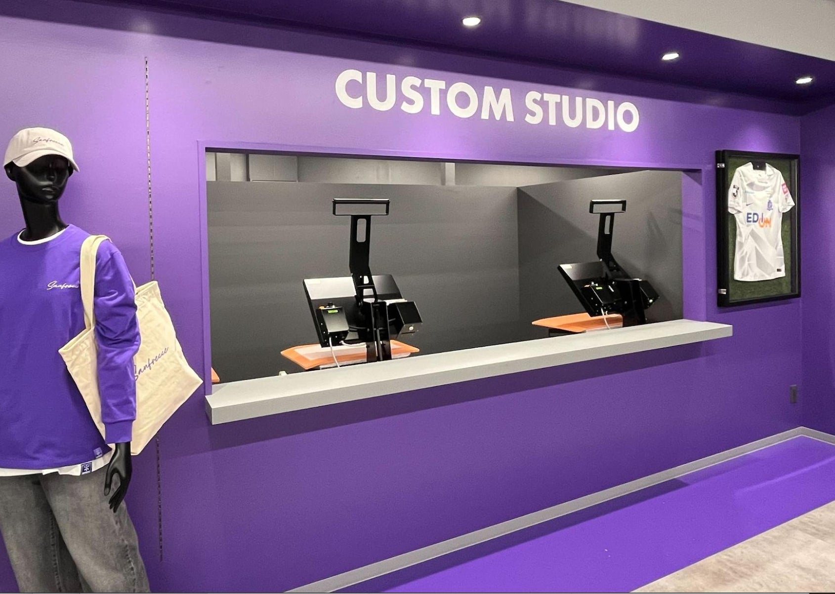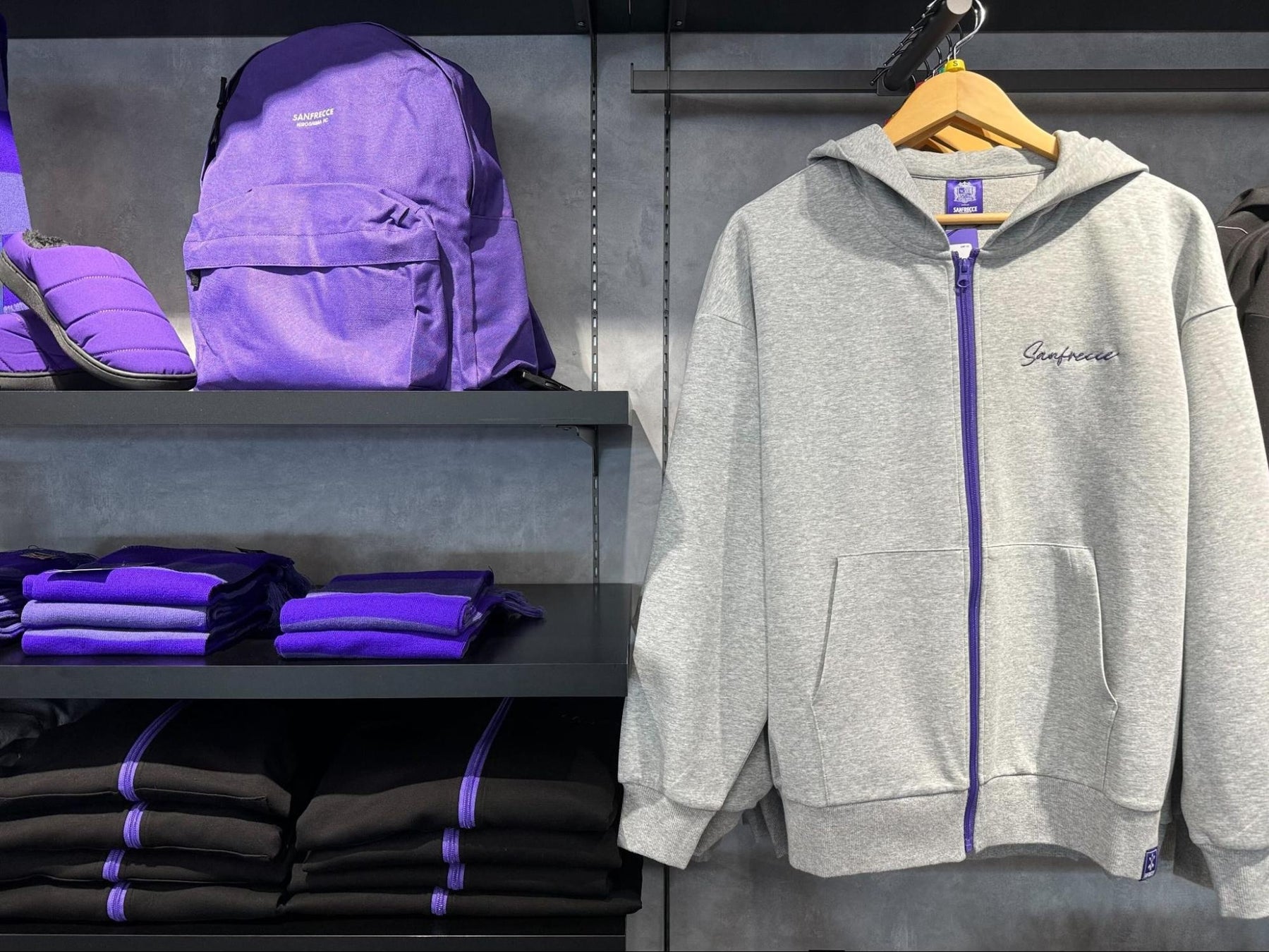 売場面積約400㎡のこの店舗は、スタジアム建築のコンクリートに調和しながら、サンフレッチェ広島のチームカラーの紫を最大限に引き立てるカラーとして使用しています。