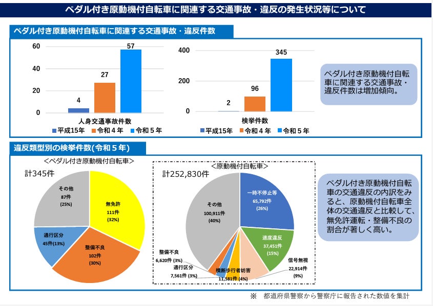 一般原動機付自転車等に該当するにもかかわらず、無免許運転や整備不良での検挙数が非常に多くなっおり、「自転車だと思っていた」と供述する被疑者も多く見られるという現状から、原動機付自転車等の運転の定義の明確化となりました。