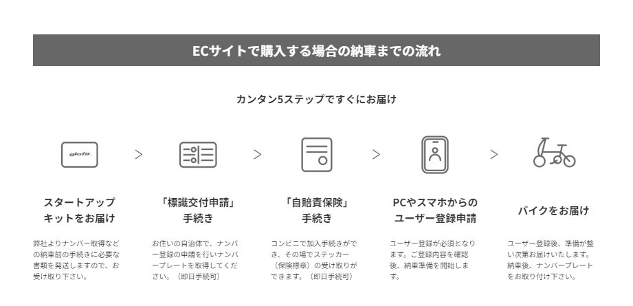 また、試行を重ねECサイトでは、ご注文後は「スタートアップキット」を先にお送りし、ナンバー登録と自賠責保険に加入後ユーザー登録で加入を報告いただき、それらを確認してから車両本体をお送りするなど、購入いただく方にも「電動バイクである」という事を認識いただいていただくスキームを独自に取り入れて運用するなど、交通ルールの遵守に販売側としても取り組んでまいりました。