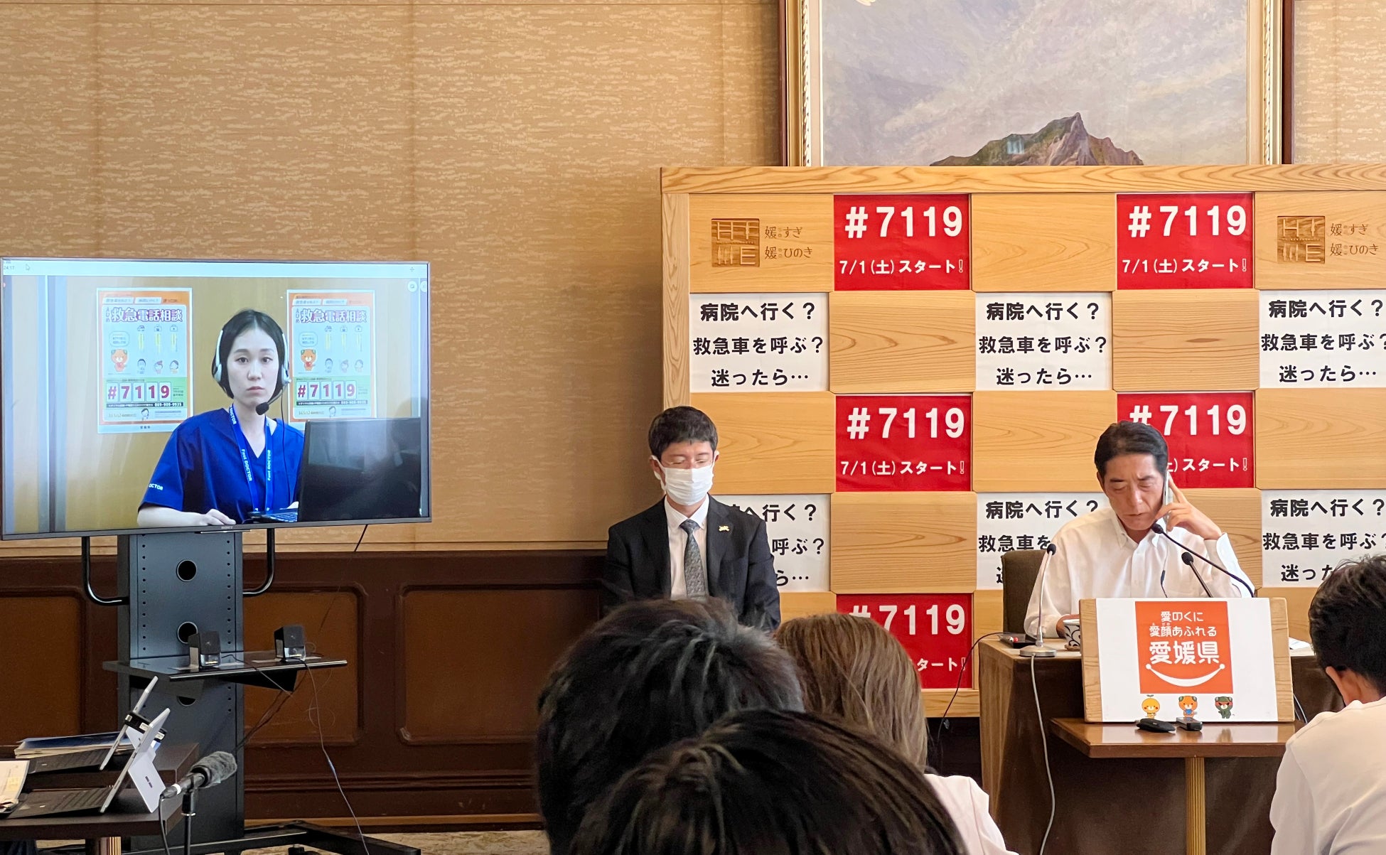 愛媛県は6月12日に行われた知事の6月度定例記者会見において、本事業を7月1日から開始することを発表しました。会見では、中村時広知事がファストドクターの看護師と共に、過度の心配から救急車を呼ぶべきか迷った県民の相談を再現するデモンストレーションが行われました。デモンストレーションでは、相談の上で救急車の必要性がなかった場合でも適切な医療機関への案内がされることも紹介され、県民の方々に適切な利用方法についての理解を深めることを目指しました。