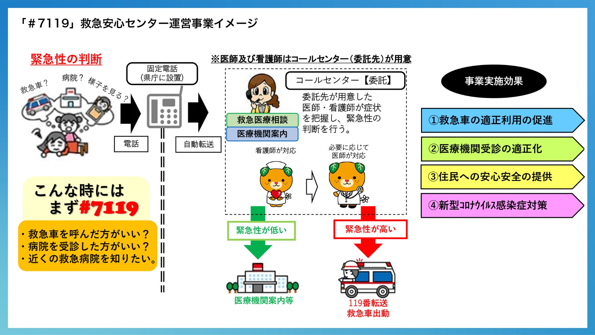 中村知事は本事業を通じて、傷病者の重症化の防止や重症者の早期発見、救急利用の適正化、コンビニ受診の抑制などが期待できると発表しています。