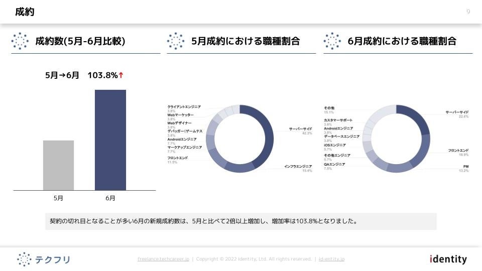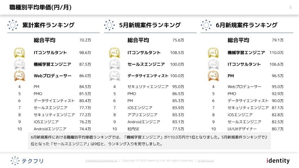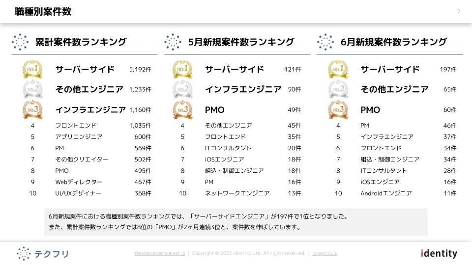 ITフリーランスエンジニアの案件・求人サイト「テクフリ」(https://freelance.techcareer.jp/)を運営する株式会社アイデンティティー(東京都新宿区、代表取締役:今野 力、以下「当社」)は、テクフリのデータベースを元に2022年6月における案件の市況感を調査しました。より詳しい結果については、お問い合わせから資料請求いただけます。
