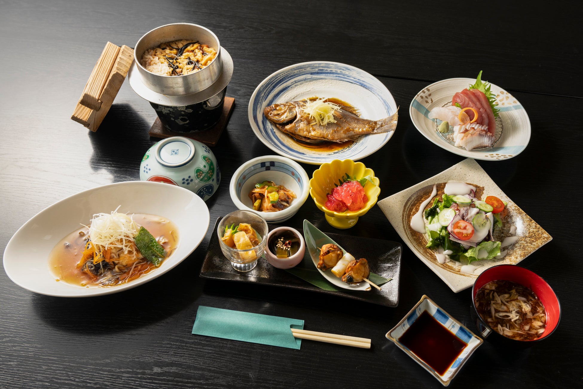 お造り、煮魚、揚げ物、釜めしまで付いたお手頃なプランです