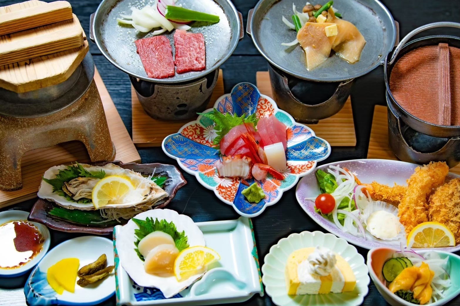 季節の海鮮や黒毛和牛、モウカザメのステーキなど、地元の食 材を贅沢に使った御膳です