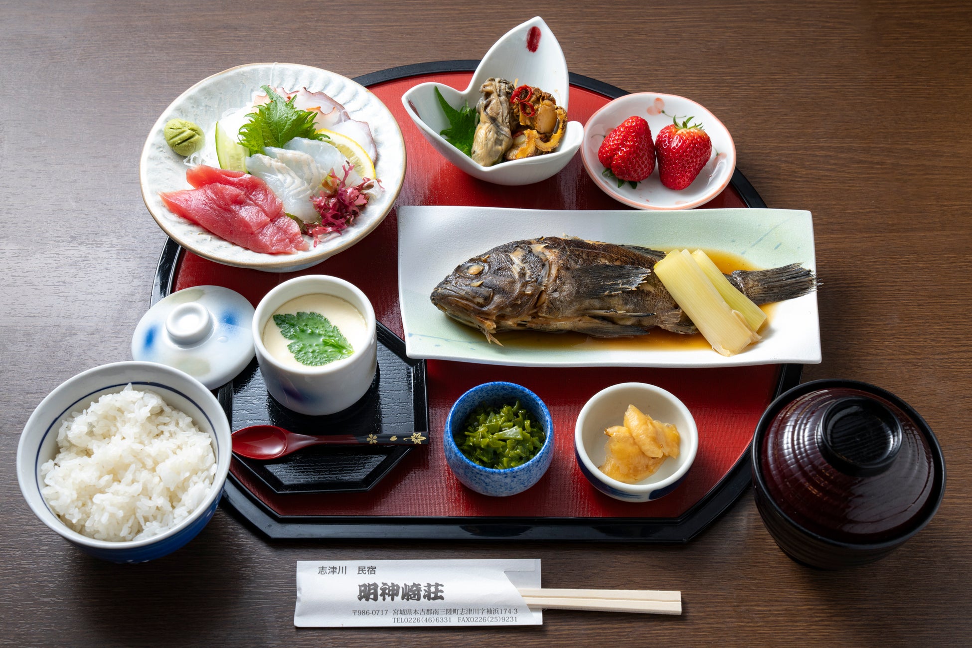 地元入谷産のご飯と志津川湾のタコや銀鮭など、山と海の幸を味わえる御膳です