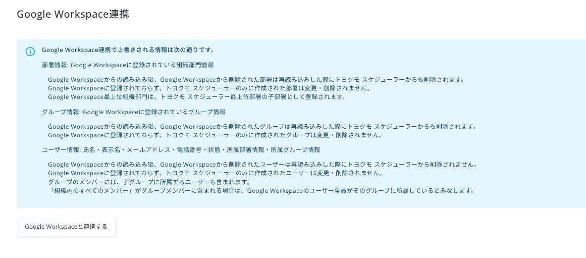 今回の連携により、「トヨクモスケジューラー」に設置した「Google Workspaceから読込」ボタン1つでユーザー情報、組織部門情報、グループ情報などが簡単に同期できるようになりました。