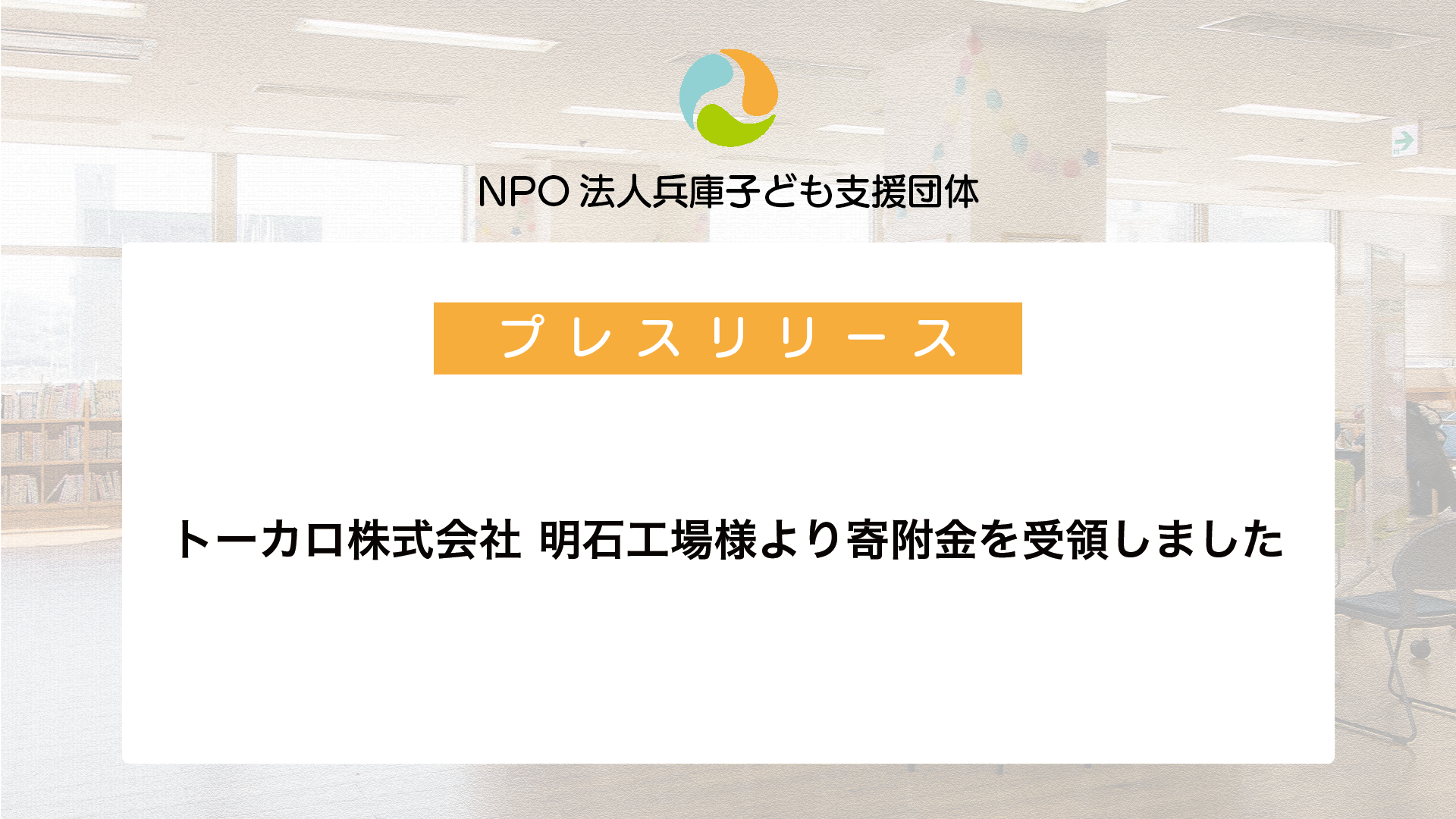 認定NPO法人兵庫子ども支援団体(所在地:兵庫県明石市、代表理事:多田実乘、以下「当法人」という)はこのたび、トーカロ株式会社 明石工場様(所在地:兵庫県明石市)より寄附金をいただいたことをお知らせいたします。同社からの寄附は2023年より4度目の受領となります。頂いた寄附金は、当法人が実施する学習支援や子どもの居場所づくり、体験活動、物品支援等、地域の子ども達やその家庭を支援するために使わせていただきます。