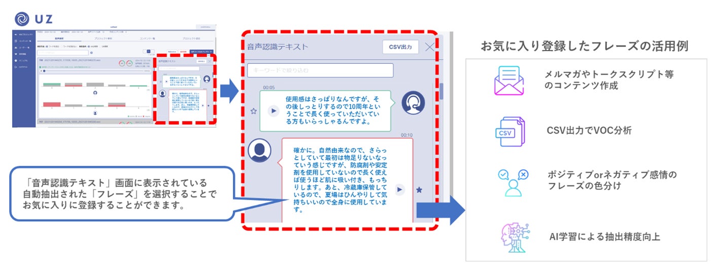 また、フレーズのCSV出力により、購入理由や解約理由、クレーム、ニーズ、ささった言葉、断り文句等のVOC分析が可能になったほか、抽出されたフレーズは、手動でお気に入り登録・解除ができ、その傾向をAIが学習することで、より精度の高いフレーズ抽出が可能になります。