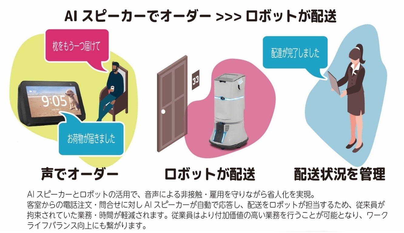 両社の提携により、ルームサービス時やアメニティオーダーなどのデリバリー時において、客室からのオーダーの受付からロボットによる配送物到着時の宿泊ゲストへのお知らせが可能になり、非接触化、運営施設のスタッフの労力軽減が図られ、ホテル、旅館などのワークライフバランス向上、省力化につながり、宿泊施設の業務が大幅に改善される見込みです。
