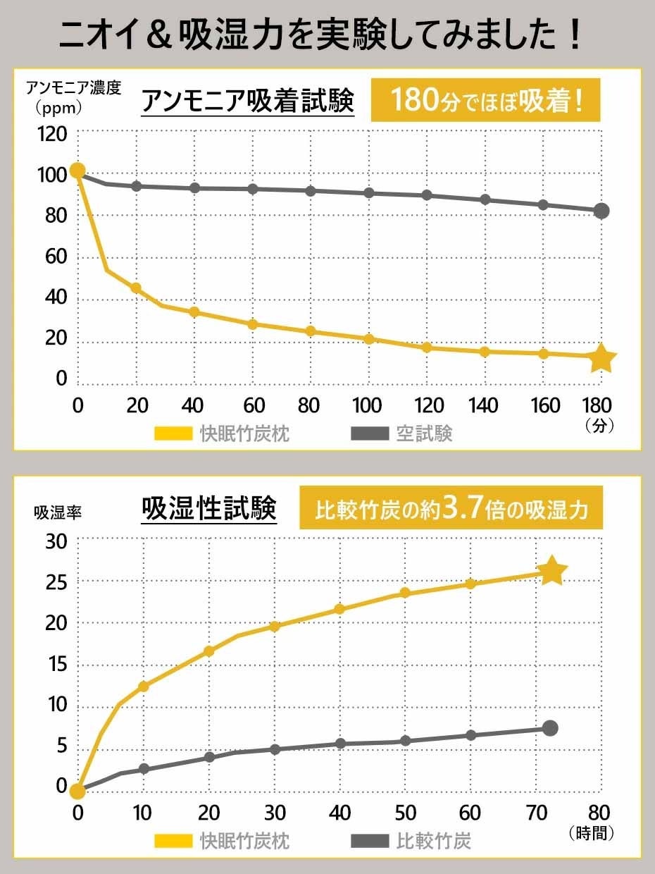 快眠竹炭枕のニオイ吸着・吸湿力の試験では、アンモニアの吸着力や比較用竹炭の約3.7倍の吸湿力が確認されています。また竹炭ベッドパッドと併用することで、さらに快適な睡眠環境を整える事が出来ます。