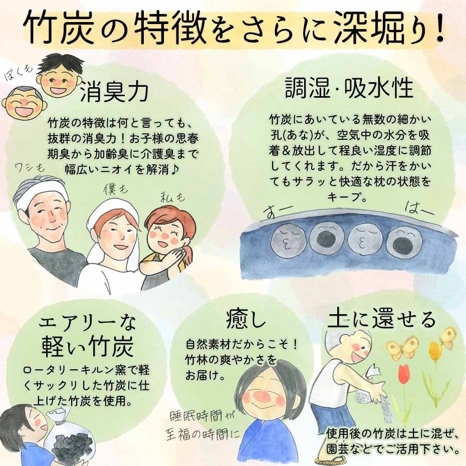 竹炭100%使用の消臭力で気になるニオイをしっかりと吸着します。高温で焼き上げた軽くてやわらかな竹炭を使用しており、枕の熱がこもる問題も解決し、朝までグッスリと熟睡できるようサポートします。竹炭の持つ以下の5つの特徴がその秘密です。