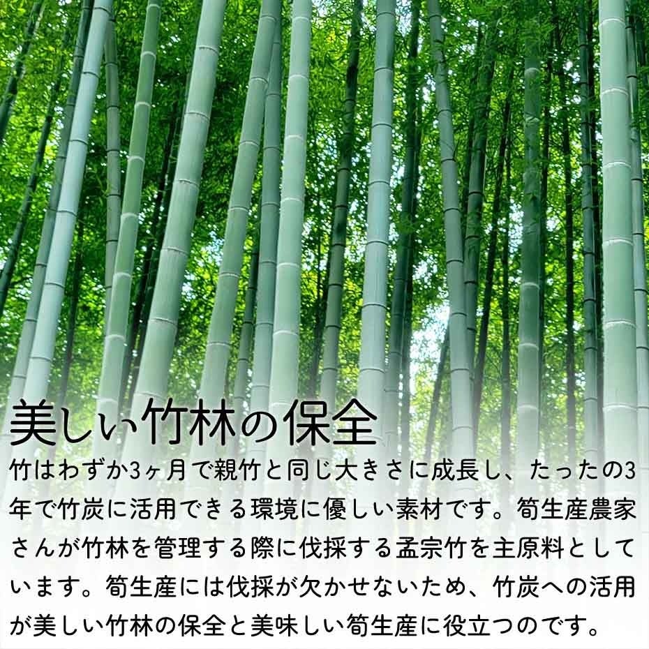 竹はわずか3ヶ月で親竹と同じ大きさに成長し、3年で竹炭として利用可能な環境に優しい素材です。本商品には筍生産農家が竹林を管理する際に伐採する孟宗竹を使用しており、美しい竹林の保全と美味しい筍生産にも貢献しています。