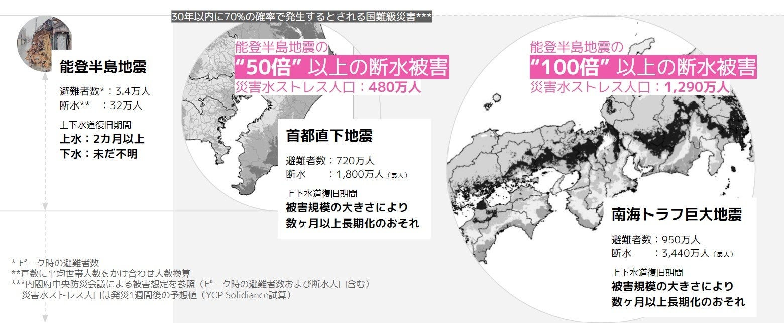 「災害水ストレス」問題は1995年の阪神・淡路大震災や2011年の東日本大震災においても深刻化し、その後トイレ対策や入浴支援は一部進んだものの、能登半島地震において、断水への備えがまだ不十分であることが露呈しました。そして今後高い確率で発生するとされている首都直下地震では今回の約50倍、南海トラフ巨大地震では約100倍もの断水被害が想定されています。過去災害のデータや内閣府中央防災会議の被害想定などを踏まえた分析によれば、「災害水ストレス人口」は首都直下地震では発災1週間後に480万人、南海トラフ巨大地震では1290万人にも上る可能性があります(YCP Solidiance試算)。こうした「国難級災害」において過去災害の悲劇が何倍もの規模で繰り返される事態を未然に防ぐためには、社会全体で対策を進めていかなければなりません。
