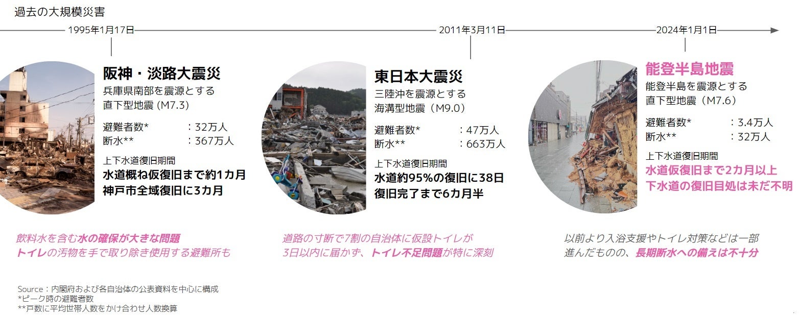 2024年1月1日16時10分に発生した令和6年能登半島地震(以下「能登半島地震」)により、多くの方々が被災されていることに心よりお見舞い申し上げます。発災から2カ月以上が経過した現在でも、17,250世帯が断水の状態にあると報告されており(2024年3月8日14時00分現在。厚労省調べ)、ライフラインの被害が依然として長期化しています。