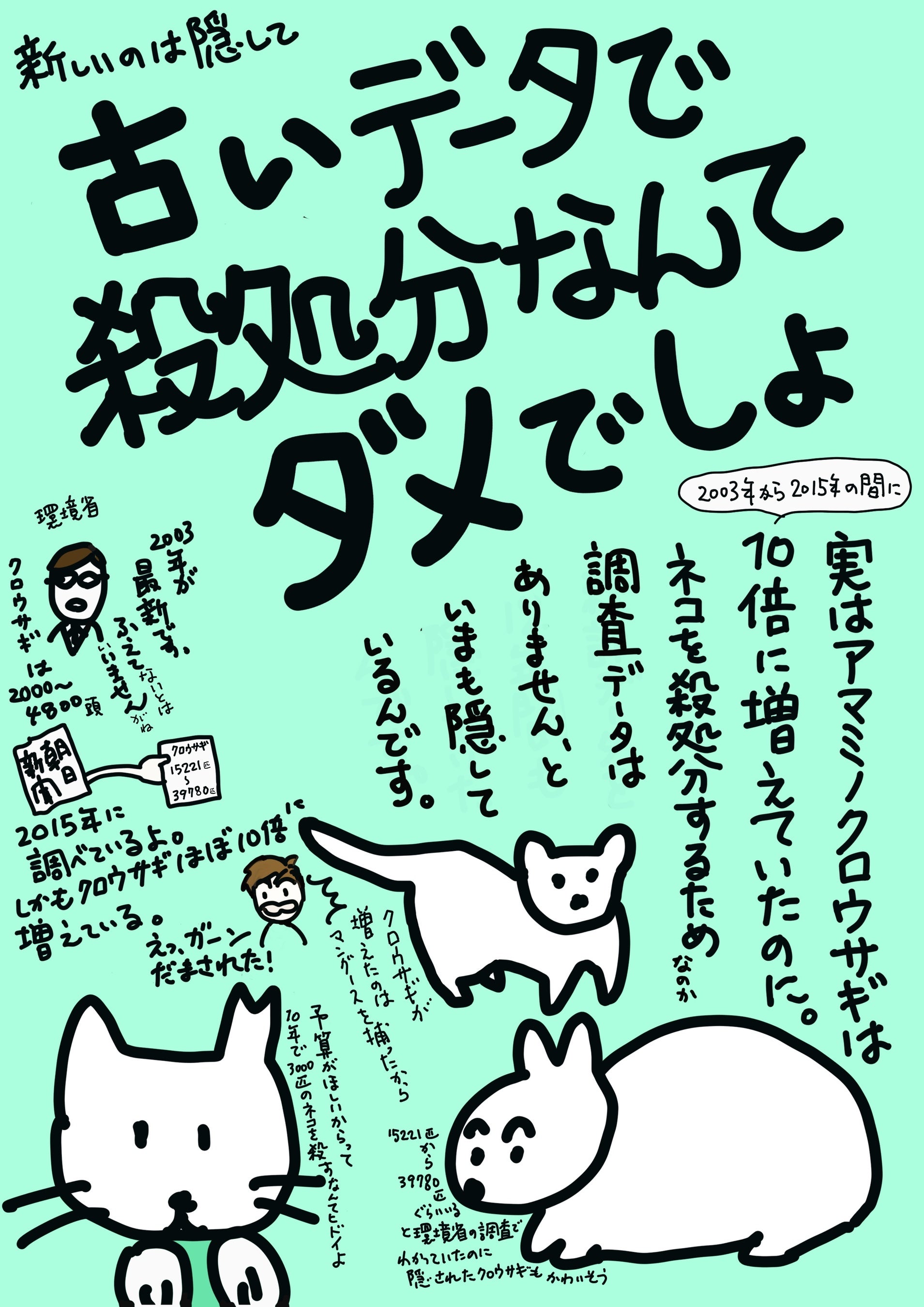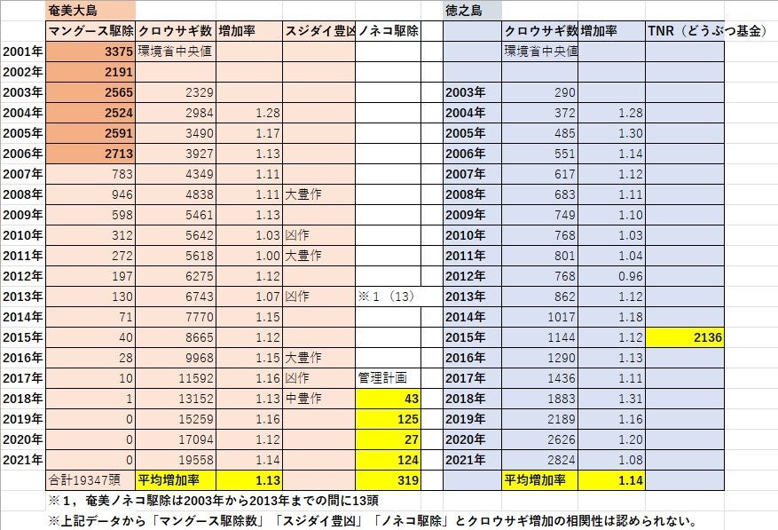 「クロウサギを絶滅させる新たな脅威ノネコを山から駆除しなければならない」という、大義名分で始まった「奄美大島における生態系保全のためのノネコ管理計画(2018年度~2027年度)」であるが、クロウサギは2003年から2017年までに奄美大島、徳之島ともに500%増加している。この間、ノネコ駆除は行われていない。(奄美で試験的に13頭の駆除が行われた)