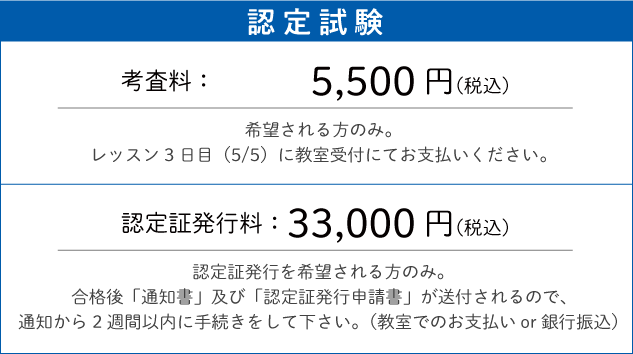 もしくは「3日間のレッスンと補講」を受けて認定試験は受けない、という選択も可能です。