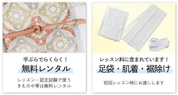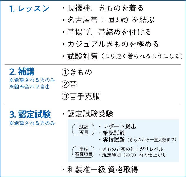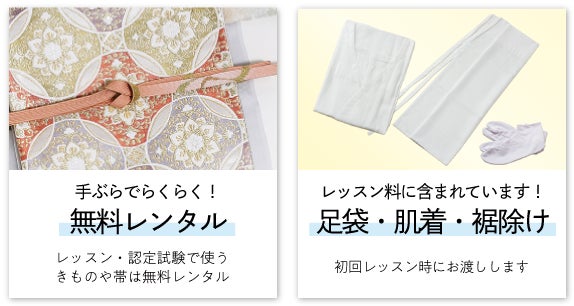 3日間の講座と、補講と認定試験(各1日)の計5日間という短期間できものの基礎が学べます。また全くの初心者の方でもきものが着られるようになり、一般財団法人日本和装協会の認定資格(和装准1級)取得まで目指せるチャンスです。授業で使用するきものや帯は無料でレンタル致します。また足袋等の肌着類も、レッスン料に含まれています。ご興味のある方は是非お申し込みください。
