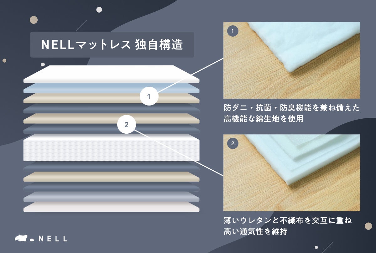 「NELLマットレス」は薄いウレタンと不織布を交互に重ねた独自の13層構造を採用しており、この構造が高い通気性を生み出しています。
