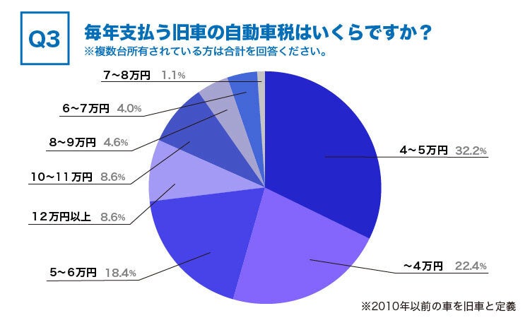 毎年支払っている自動車税について金額を聞いてみたところ、最も多い回答が4〜5万で32.2%でした。4〜5万円と答えた多くの方が1台の所有だったことから、排気量が1.5ℓ超2ℓ以下の旧車を所有している割合が高いことがわかりました。(1.5ℓ超2ℓ以下の重課税率自動車税:45,400円)