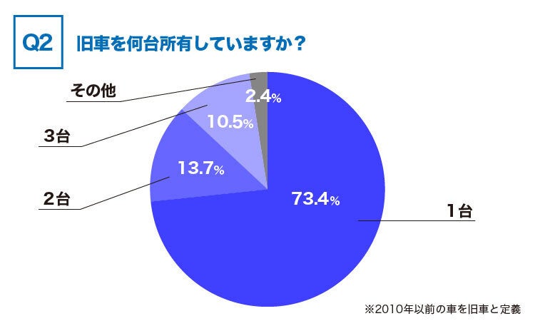 次に旧車を何台所有しているか聞いてみると、1台と答えた方が73.4%、次に多かったのが2台で13.7%という結果になりました。