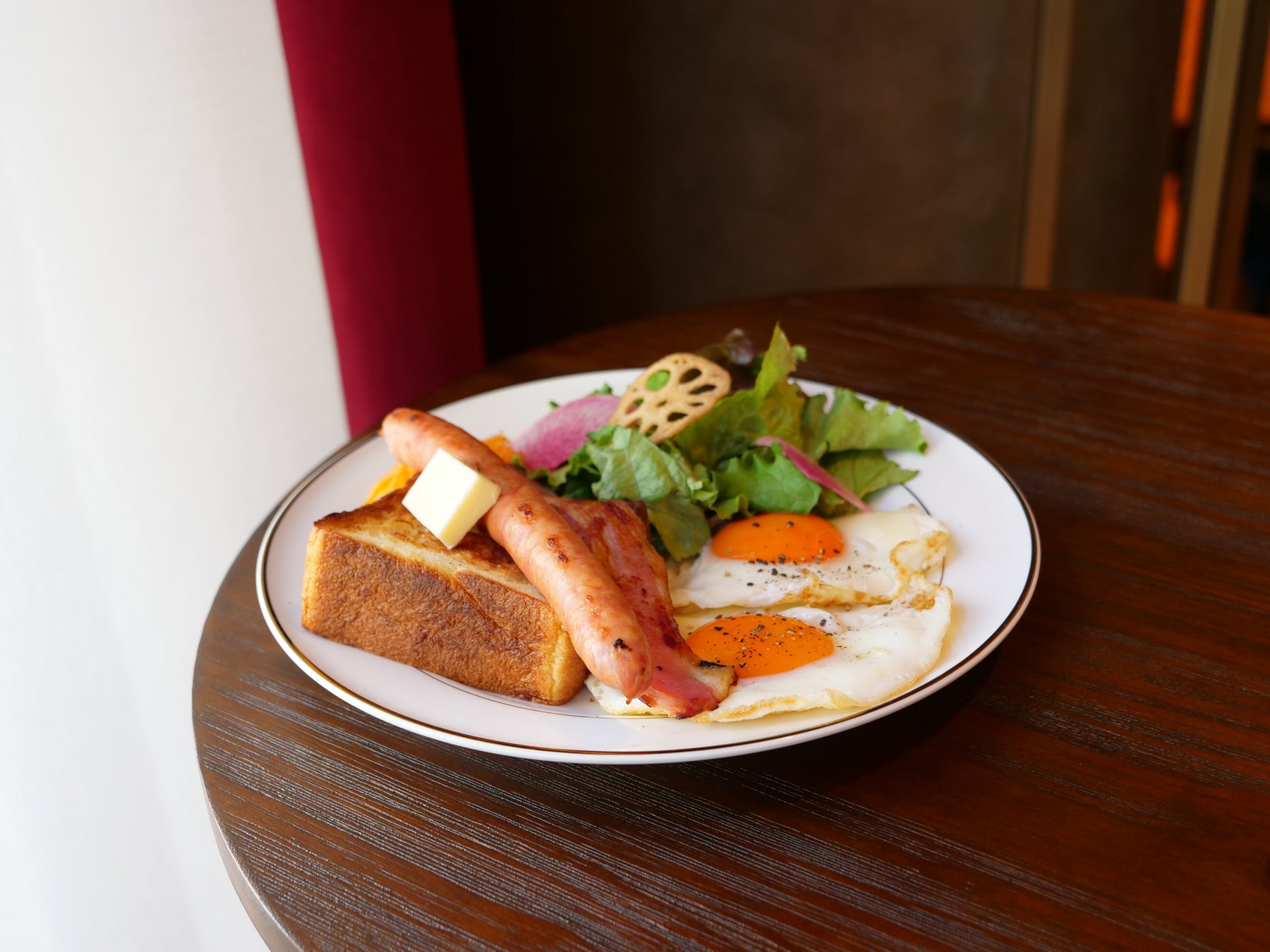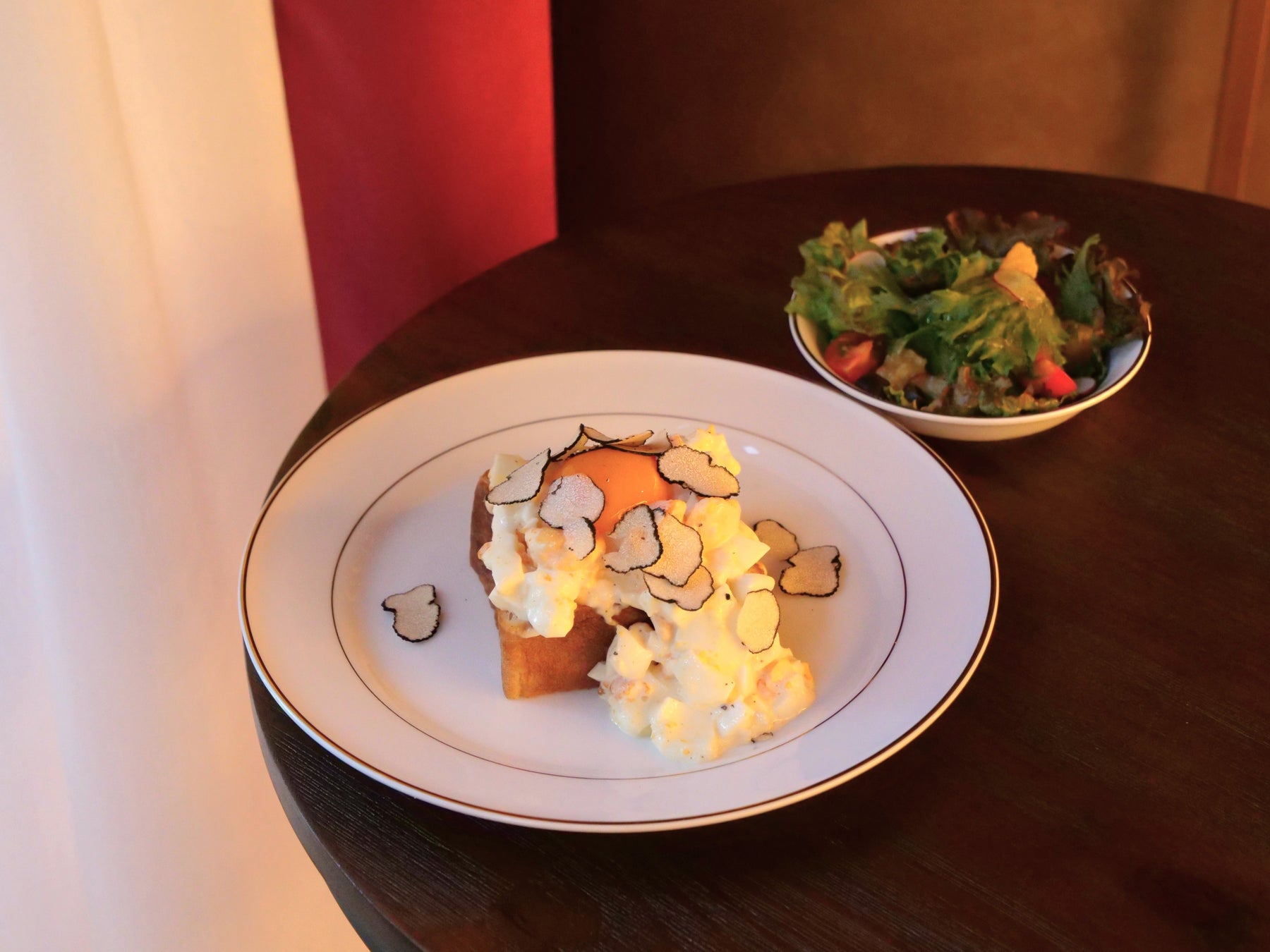 バターをのせて焼いたムーに黒トリュフが香る蘭王卵サラダをたっぷりのせ、仕上げにフレッシュな黒トリュフを削った香り豊かなトーストです。