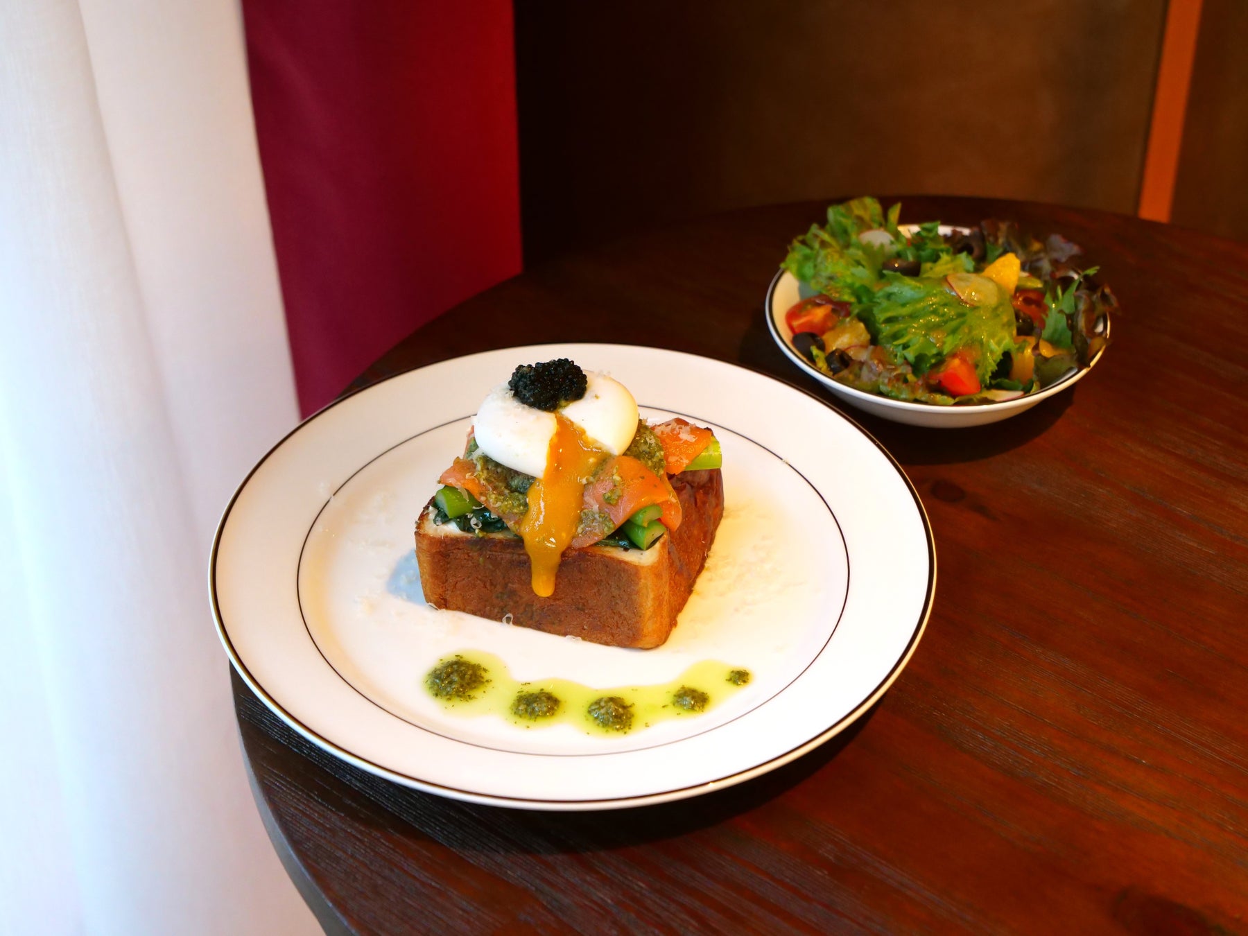 サクッと焼いたムーにクリームチーズを塗り、アスパラ、ほうれん草、スモークサーモン、卵の上にキャビアを贅沢にのせました。