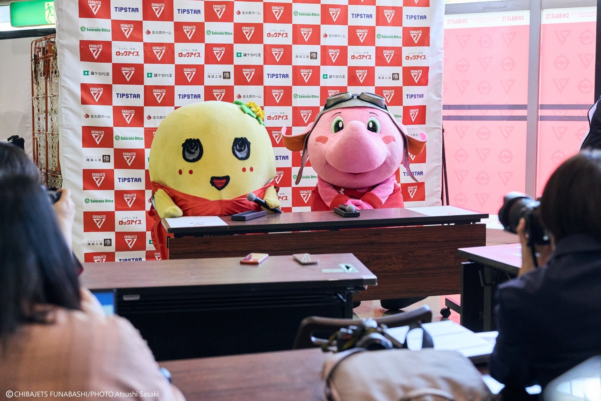 記者会見ではふなっしー、ジャンボくん共に3年連続プロ選手契約をできた嬉しさを伝えた。1年目の契約条件は「ふなっしー:梨274個、ジャンボくん:お菓子200個」2年目は「ふなっしー:梨(特選)6個、ジャンボくん:お菓子の家セット」だったが、今シーズンは、「ふなっしー:梨1年分(出来高払い)、ジャンボくん:お菓子1年分(出来高払い)」という過去最高の契約条件となった事について、ふなっしーはチームからの評価に大満足で1発サインとなった。また、「池内GMにも事前に伝えたんだけど機も実も熟しただけに、今回は大野HCに出場したい気持ちを直談判したなっしー!でも、体力の部分で不安があるからと今日はベンチ入りできなかったなっしなー。ただ、明日もあるし、チャンスがあるかぎり諦めないで挑み続けるなっしー!!」と強く意気込みを語った。