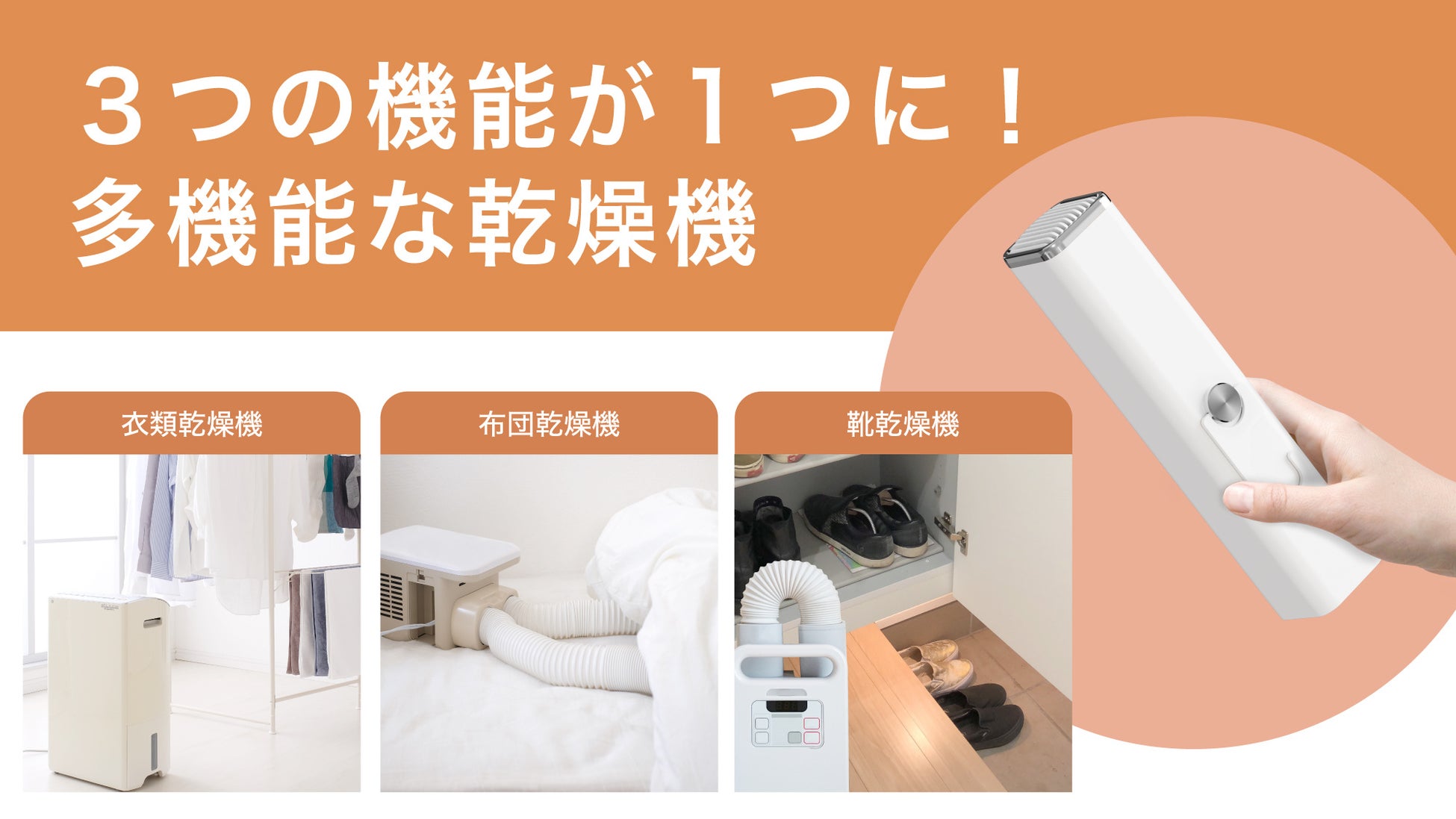 新製品のコンパクト衣類乾燥機は、軽量かつ使いやすい設計で、衣類、布団、靴、クローゼット、靴箱など家中のあらゆる物を手軽に乾燥させることができます。冬の布団乾燥や雨の多い季節に大活躍し、オールシーズン通して誰でも簡単に使用可能です。