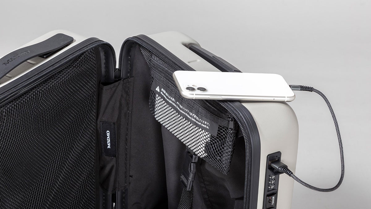 ご自身のモバイルバッテリーを収納して、スーツケース側面上部から電源を取ることができます。手持ちカバンにバッテリーを入れる必要がないので、これまでよりも身軽にご旅行いただけます。
