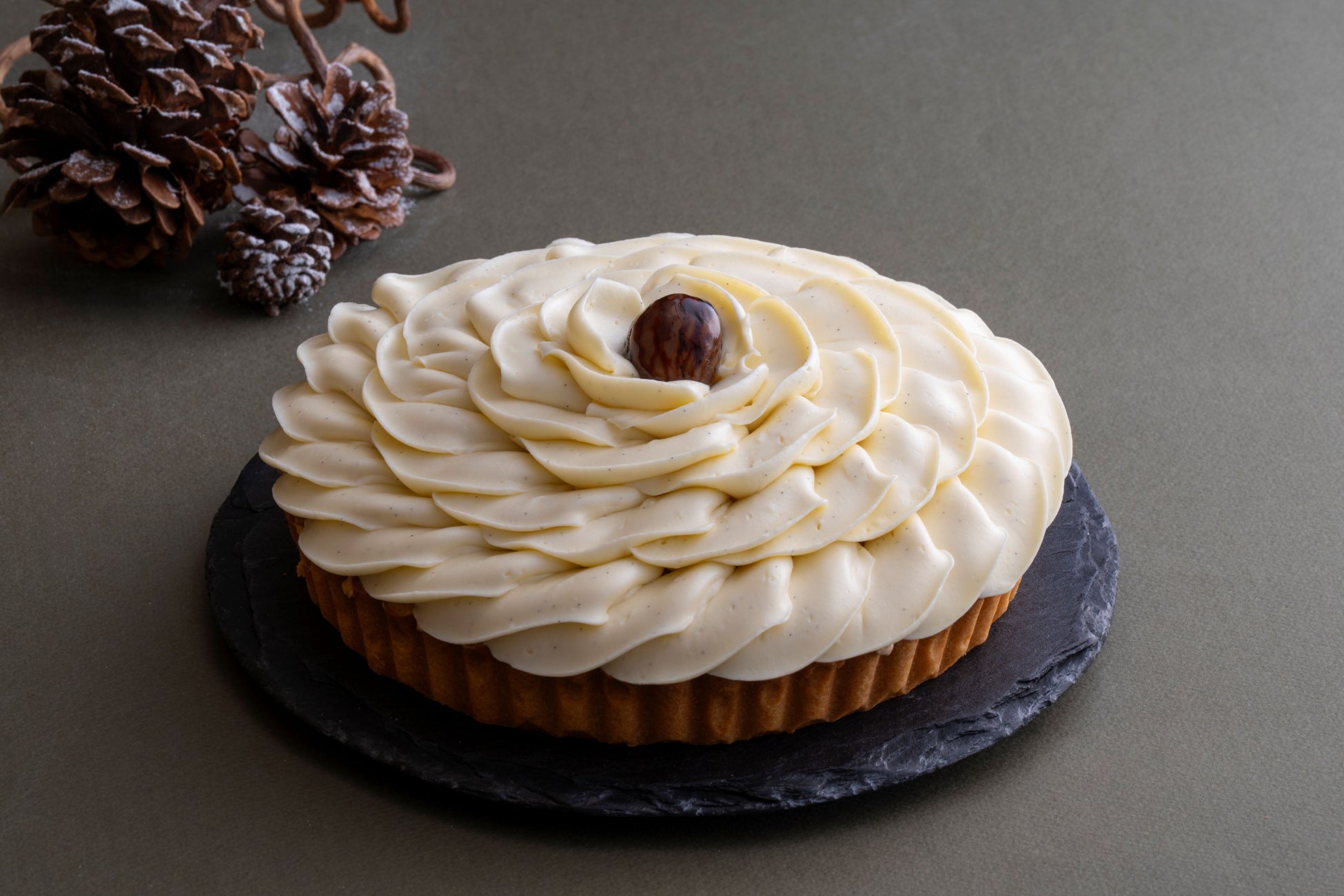 栗の深いコクとバニラクリームの優しい甘さが織りなす、エレガントなタルトです。香ばしく焼き上げたサクサクのタルト生地の土台に、風味豊かなフランス産マロンムースをたっぷりと詰めています。ムースの中には、丁寧にカットした栗の渋皮煮を贅沢に忍ばせ、食感と風味のアクセントに。最後に、口どけの良いバニラクリームを絞り上げ、まるで満開の花のように仕上げています。エレガントな見た目と贅沢な味わいがフェスティブシーズンにぴったりです。