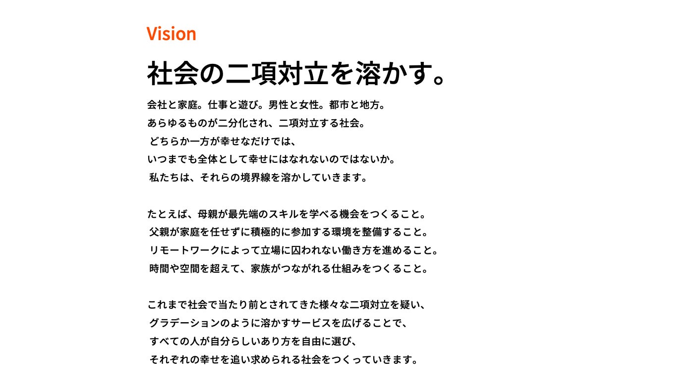 2012年に会社を始めた頃とは異なり、事業や組織が大きくなるにつれて「会社は事業・プロダクトを通じてだけではなく、組織や雇用を通じて社会づくりを担うもの」という考えが強くなりました。2019年以降は新経営体制のもとで、より社会の課題に踏み込んだ事業展開やソリューション提供に加えて、これからの社会の「あるべき姿」を意識し、男性育休義務化を始めとする新しい社会づくりに繋がる制度推進や組織づくりも行ってきました。Timersという会社で挑戦してきたことを改めて振り返り、また今の日本の状況と悲観せず未来と向き合い、自分たちが進むべき方向を模索する中で出会った「社会の二項対立を溶かす。」という言葉は、Timersの目指すべき指針として、痛烈に、そして重く深く、響くものでした。同時に、まだまだ自分たちが挑戦し続ける意味をより多くのステークホルダーに共有できる言葉でもあり、Timersが創業以来初めて据える“ミッション”となりました。まだまだ道半ばのチームですが、新しい挑戦を重ねるTimersを見守っていただればと思います。