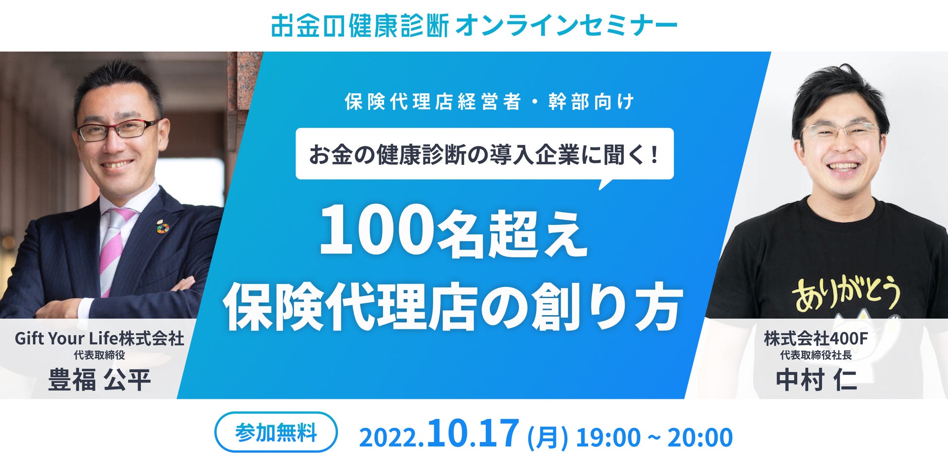 お金の相談マッチングプラットフォーム「お金の健康診断」を運営する株式会社400F(フォーハンドレッド・エフ、本社:東京都中央区、代表取締役社長:中村 仁、以下「400F」)は、2022年10月17日(月)19時よりオンラインにてプルデンシャル生命のトップセールスから、140名の保険代理店を立ち上げたGift Your Lifeの豊福社長と弊社代表の中村で、100名超え保険代理店の創り方についての対談を行います。