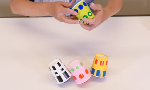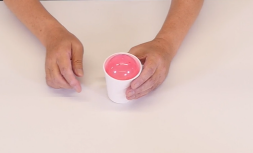 1. 紙コップの飲み口の部分に、ガシャポンの空きカプセルを差し込むだけ!空きカプセルの差し込み具合で、回り方が全く変わるので、どんな差し込み具合が一番長く回るか、研究してみましょう。