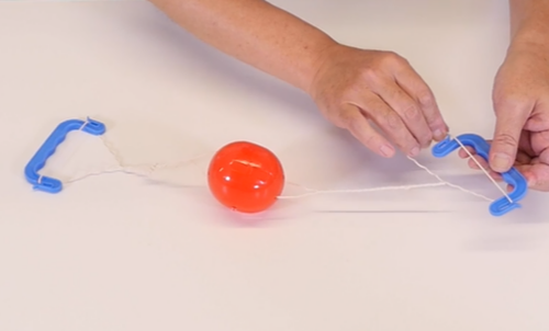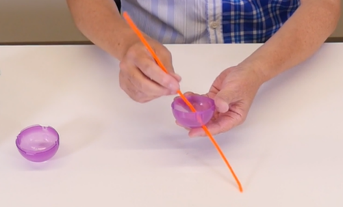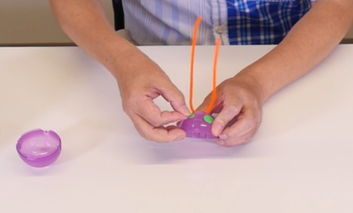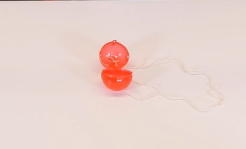 1. ガシャポンの上下一体型カプセルに開いている左右の穴に、たこ糸を通して、たこ糸が抜けないようにしっかりと結びます。