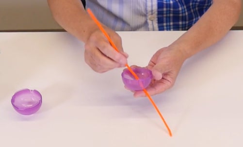 2. ガシャポンの空きカプセルに開いている穴にモールを通し、裏側からセロハンテープで留めて「虫の触覚」を作り、カプセルにシールを貼って「目玉」を作ります。