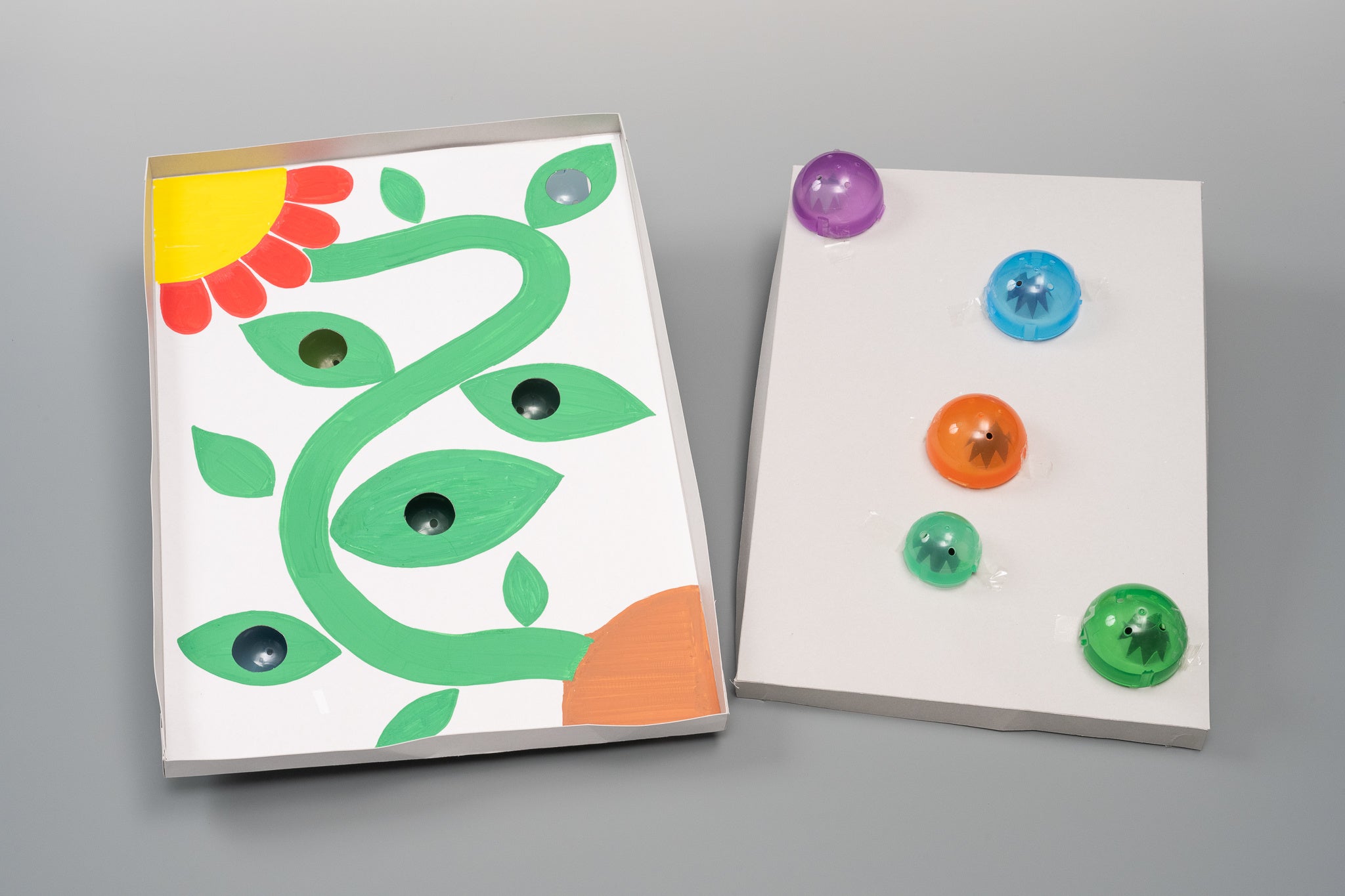 5. ペットボトルのフタなどを使って円を描き、丸く穴を開けた厚紙や空き箱 に、色画用紙などを使って「花」を描きます。「ガシャポンコロコロ虫」が 穴に落ちないように転がして遊びます。