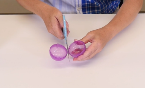 1. ガシャポンの上下一体型カプセルを使い、上下連結 部分をはさみで切り取って半分の大きさにします。上下それぞれの結合部分(でっぱっている部分)も切り取ります。