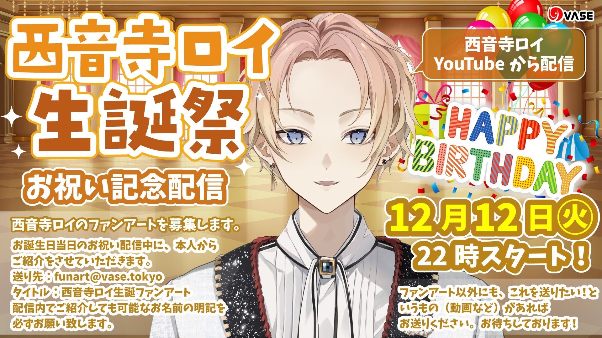 バーチャルライバーグループVASE(ヴェイス)に所属する西音寺ロイが、2023年12月12日(火)誕生日当日に「生誕祭配信」を開催。