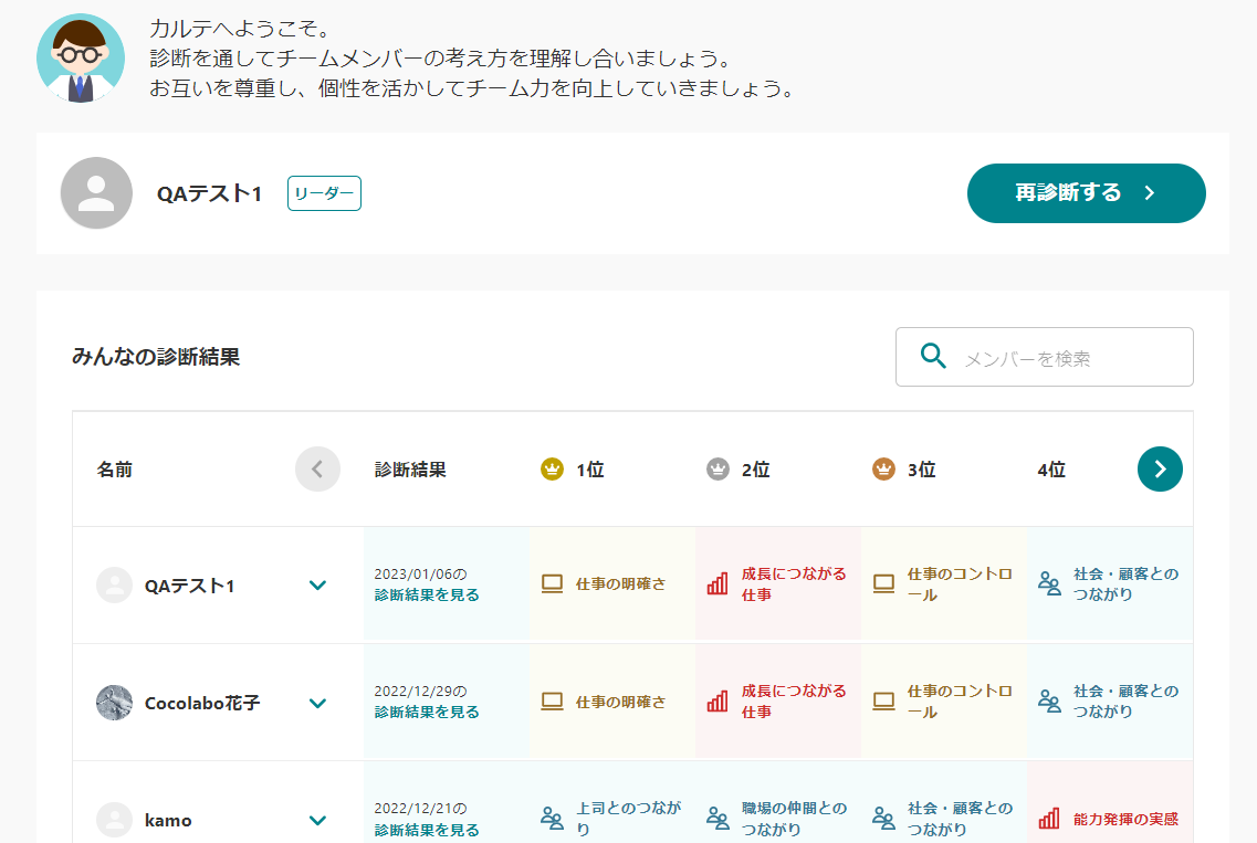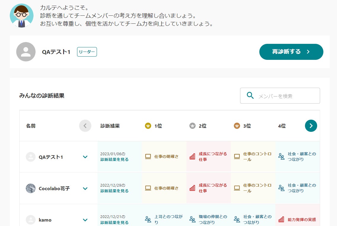 本診断「カルテ」は、企業研修におけるエンゲージメント向上コンテンツとして、「Cocolabo(ココラボ)」を使用したお客様より大変ご好評をいただいており、この度、Cocolaboの対話ツールの一つとして新たに誕生しました。