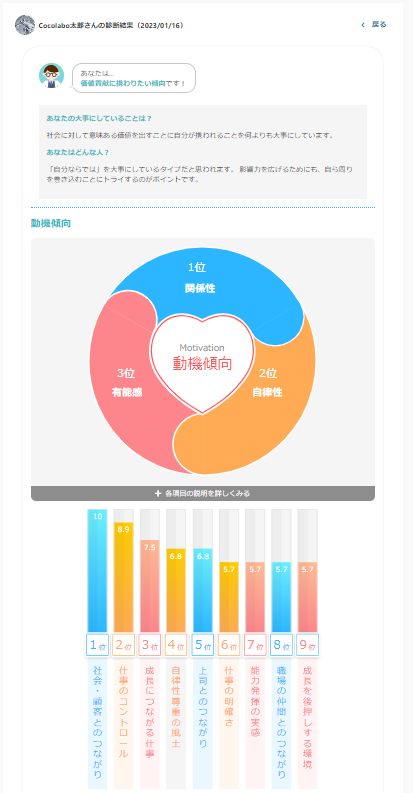 「Cocolabo(ココラボ)カルテ」は、働く上で大事にしている価値観を40問からなるアンケートに答えることで、可視化するツールです。仕事の中で、気軽に雑談や相手の背景を知るような余談が憚られる時代において、短い時間で相手の大事にしている価値観を知ることが可能です。
