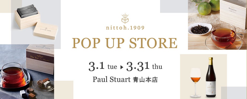 三井農林株式会社(所在地:東京都港区、代表取締役社長:佐伯 光則 以下、当社)は、お茶を通じた体験型コンテンツを提供するECサイト「nittoh.1909」の期間限定ショップをオープンします。世界中から選りすぐりのファッションを集めるスペシャリティストア「Paul Stuart 青山本店」で、nittoh.1909でしか出会うことのできない紅茶をラインナップしてお待ちしております。普段はECサイトでしか販売していないnittoh.1909の製品を、実際に手に取ってお買い求めいただける貴重な機会となっております。