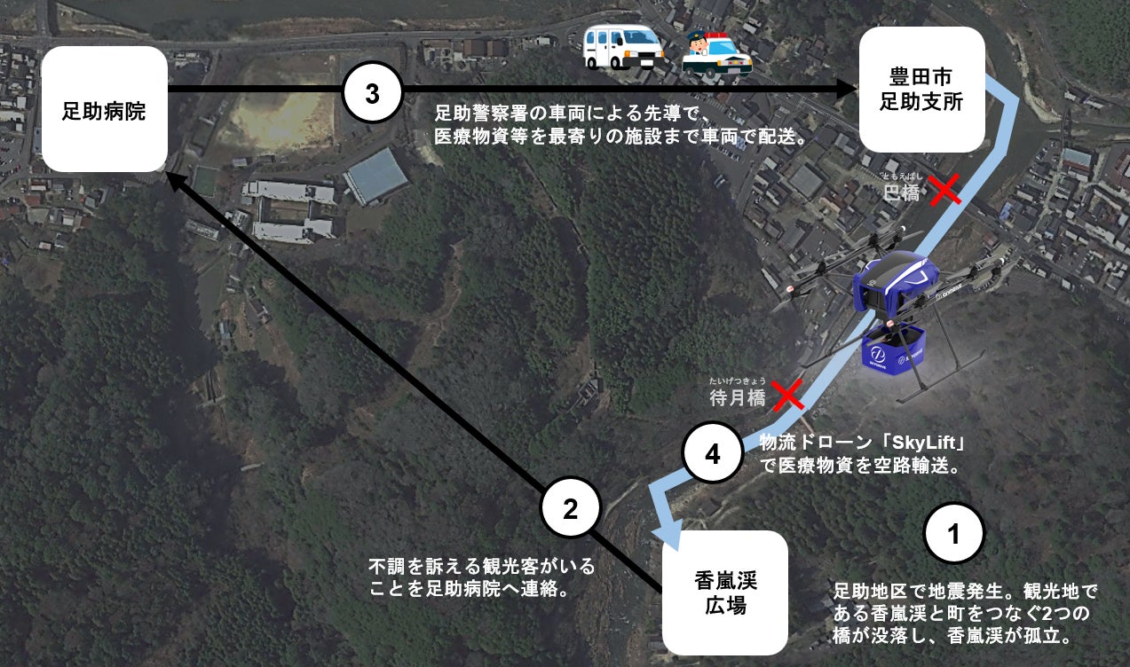 この度、豊田市民の皆様の安全と地域の持続的な発展を目指し、足助地区での地震発生を想定し、足助病院主導のもと医療物資等を運搬する実証実験を実施する運びとなりました。